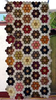 der Hexagonquilt wächst sehr langsam , aber jetzt wird schon erkennbar, dass es sich bei dem hellen Stoff um einen Farbverlaufsstoff handelt, welcher von hell nach dunkel verläuft - das Top wird also in der Mitte hell und zu den Seiten hin immer dunkler, während die Blumenmittelteile von dunkel nach hell angeordnet sind. Um die nächste passende Farbe auszusuchen, hänge ich die Arbeit auf, denn mit etwas Entfernung fällt die Entscheidung der Farbverteilung leichter.